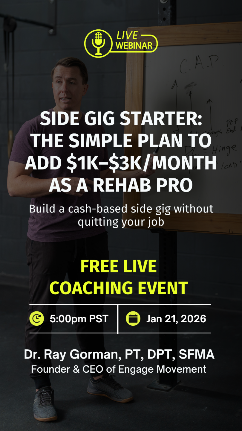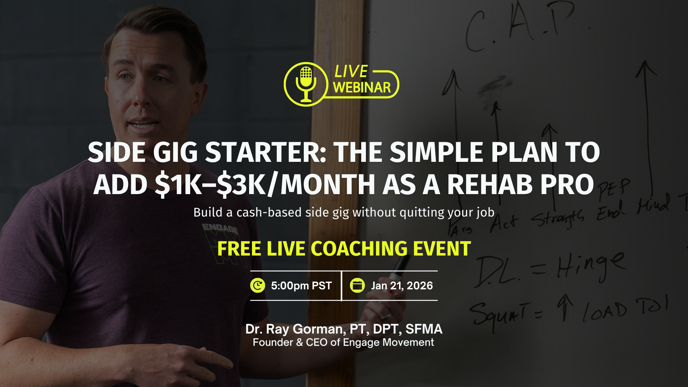 As a Doctor of Physical Therapy and founder of Engage Movement, Ray has helped rehab and performance professionals move out of the clinic-first mindset and start building simple, sustainable side gigs that actually fit around a full-time job. Not theory. Not hype. Real-world models built step by step.